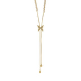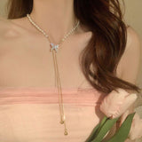 This elegant long necklace combines lustrous pearls with a delicate butterfly motif and flowing tassels for a graceful, feminine touch. Featuring an adjustable pull-through design, it offers versatile styling options to complement any neckline or outfit.
