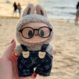 This Bear Denim Overalls Set is designed for 17cm Labubu dolls, featuring cute bear-shaped buttons on the overalls, a matching hat, and stylish glasses. Perfect for adding a fun and fashionable touch to your doll's collection.