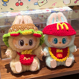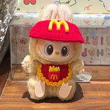 Serve up some fun with this quirky Fast Food-Themed Crochet Outfit Set! Designed for 17cm Labubu dolls, this handmade set transforms your doll into a cheerful burger or fry server — complete with a soft burger hood, red cap, and adorable fry pouch or bib.