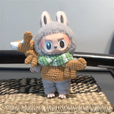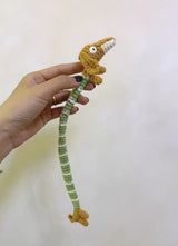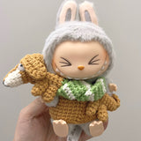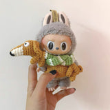 This playful crochet scarf is shaped like a long-bodied puppy with a cozy striped body and floppy limbs. Wrap it around your doll like a cuddly friend — both stylish and snug!