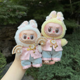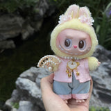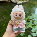 This beautifully handcrafted doll outfit blends modern Chinese style with delicate feminine details. Designed in soft pastels, it features a floral embroidered top, denim-style pants with lace trim, and elegant accessories like a pearl fan and gold pendant. The matching floral hairpieces complete the refined and graceful look.