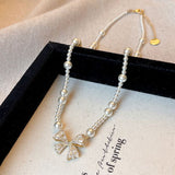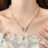 Elevate your elegance with this exquisite pearl necklace featuring a delicate bow-shaped pendant. Crafted for a refined, luxurious look, this lightweight collar necklace adds a touch of sophistication to any outfit.