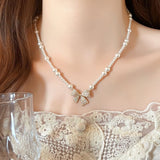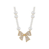 Perfect for enhancing both casual and formal styles, its minimalist design highlights the timeless beauty of pearls combined with a charming bow accent. Experience the subtle glamour and versatile appeal this necklace brings to your jewelry collection.