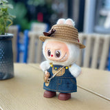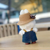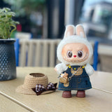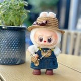 This adorable Straw Hat and Pinafore Dress Set for 17cm Labubu dolls features a cute and casual design. The set includes a denim pinafore dress with a playful bear print, a stylish straw hat with a bow, a cute panda accessory, and brown short boots—perfect for a laid-back, fashionable look.